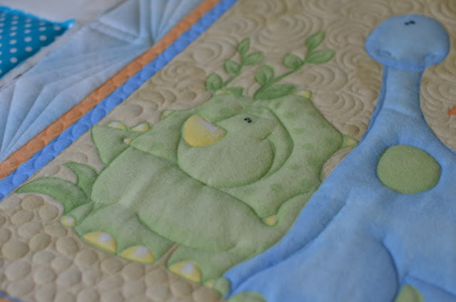 I had a blast doing some custom quilting on this cute little flannel dino panel. It's actually hanging up at a local quilt shop right now! I was so happy with how it turned out, there ended up being a ton of pictures.
