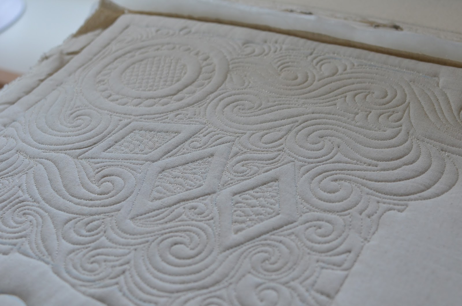 I loaded a large piece of muslin and just had some fun doodling and practicing some different shapes and motifs. I love to just not have any pressure and do what I want to, whatever comes to my brain. Loved how it turned out. Used wool on top of 70/30 blend batting, and then silver, gold, and green metallic thread.