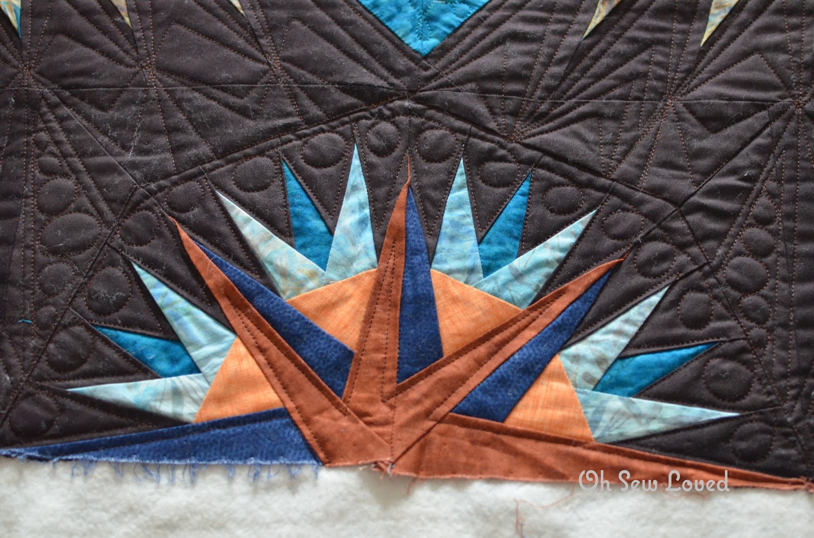 Phew!! This one was a giant, clocking in at 118" x 118"!! Largest one I've ever quilted. Pieced by Phyllis, this pattern is called Mariner's Compass by Judy Niemeyer. I am extremely happy with how this one turned out, it's so gorgeous. Multiple colors of Glide thread by Fil-Tec were used, as well as Quilter's Dream batting. Now let's get to the pictures!